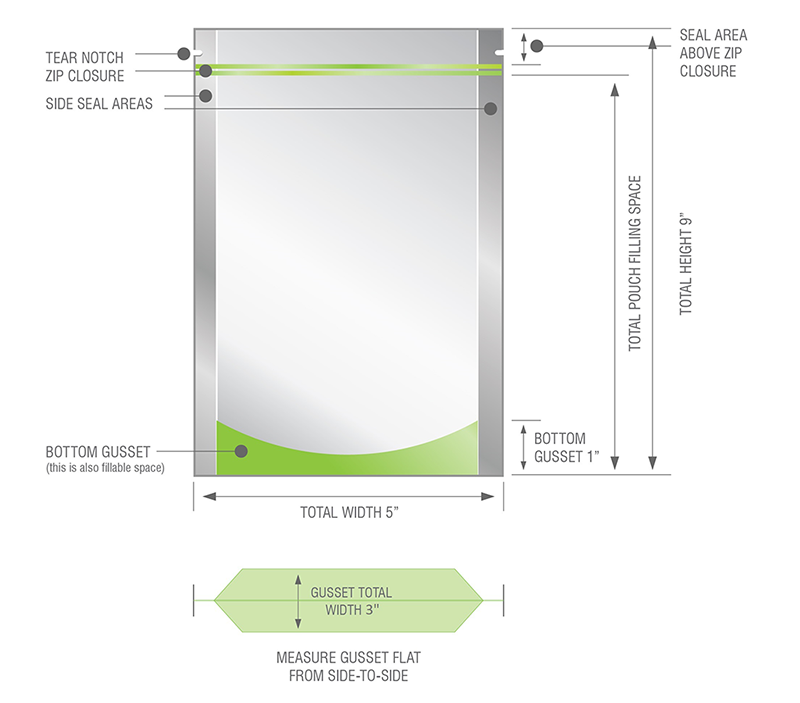 Bottom Gusset: Two times the dimension from the outside bottom edge of the pouch to the maximum depth of the internal fold.